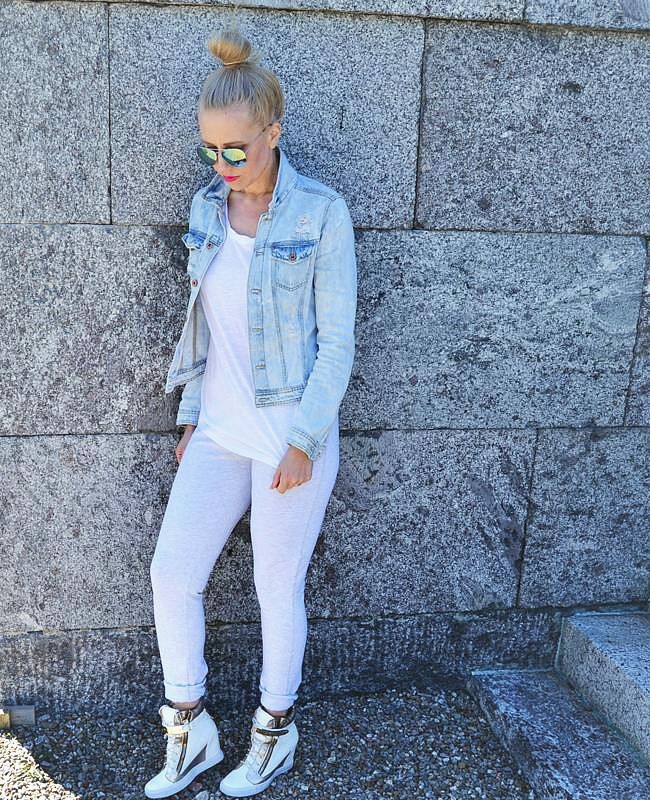 Pitkän tauon jälkeen vetäsin taas rennot colleget jalkaan. Tällä kertaa en yhdistänyt niitä korkkareiden kanssa,vaan nyt pääsi matkaan mukaan kiilakorkotennarit. Jotta asuun saataisiin pieni liraus ns.juhlallisuutta,lisäsin pinkkiä huulipunaa huuliin :) Hiuksia en oo jaksanu moneen päivään sen koomin laittaa,vaan vakkari nutturalla menty monta päivää eteenpäin.
